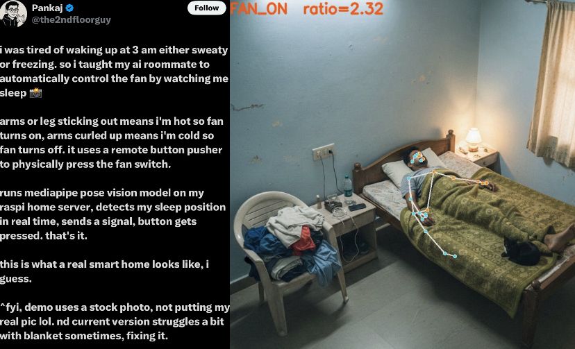 He shared a photo of his bedroom setup online, showing camera overlays marking body joints and a display reading “FAN_ON ratio=2.32,” which indicates how the pose detection system works.